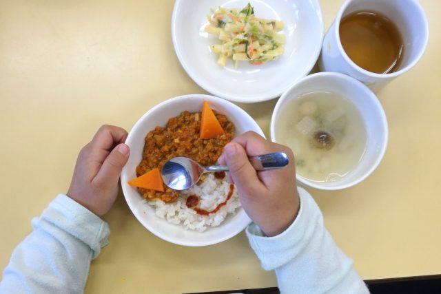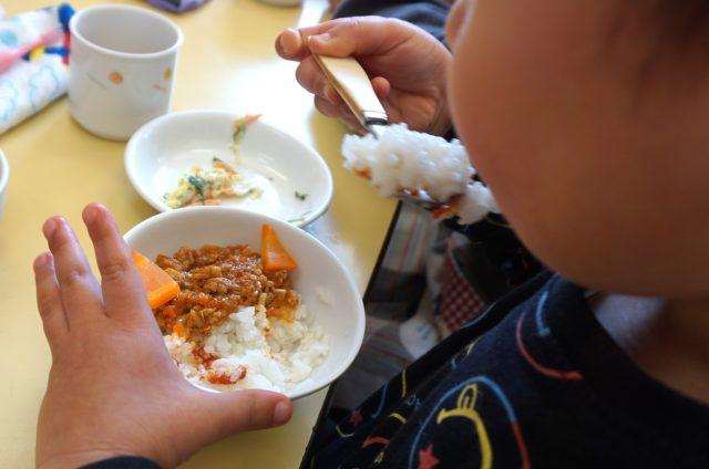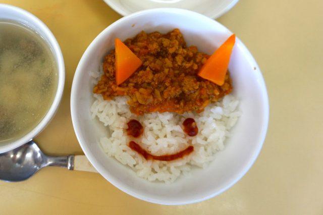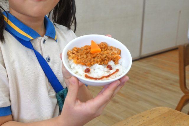 給食は鬼丼です。鬼さんを食べて、お腹の中の鬼を追い出しましょう。
